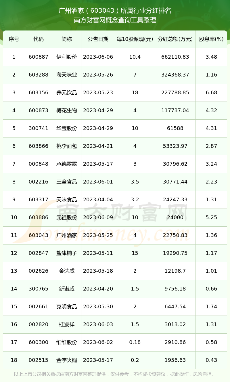 按照南方財富網(wǎng)趨勢選股系統(tǒng)統(tǒng)計,廣州酒家所屬行業(yè)為食品飲料行業(yè),食品飲料行業(yè)分紅排名情況如下表: