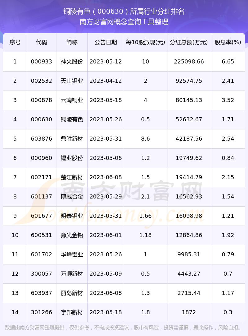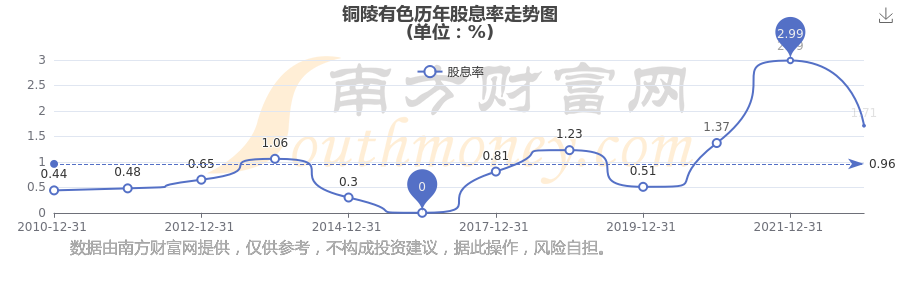 按照南方財富網(wǎng)趨勢選股系統(tǒng)統(tǒng)計,銅陵有色所屬行業(yè)為銅產(chǎn)品行業(yè),銅產(chǎn)品行業(yè)分紅排名情況如下表: