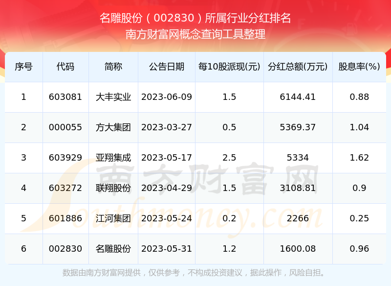 二、名雕股份002830行業(yè)分紅排名
