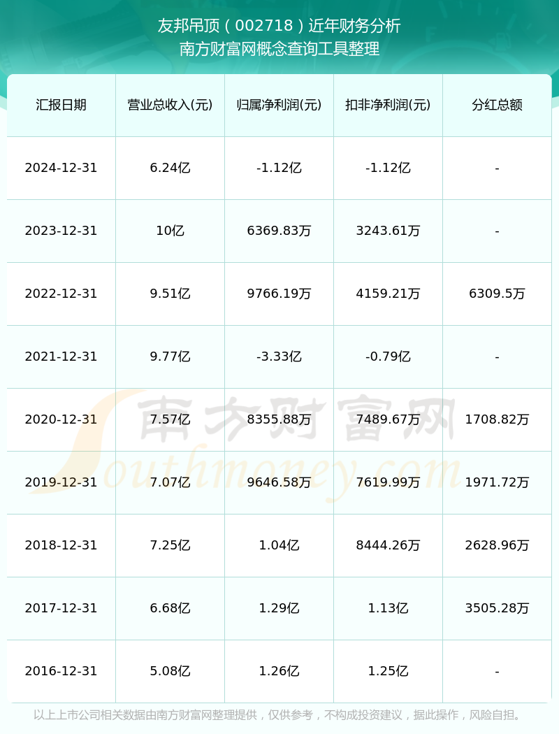 2024年友邦吊頂總營收6.24億,同比增長-37.55%;凈利潤-1.12億,同比增長-276.23%;銷售毛利率24.81%。